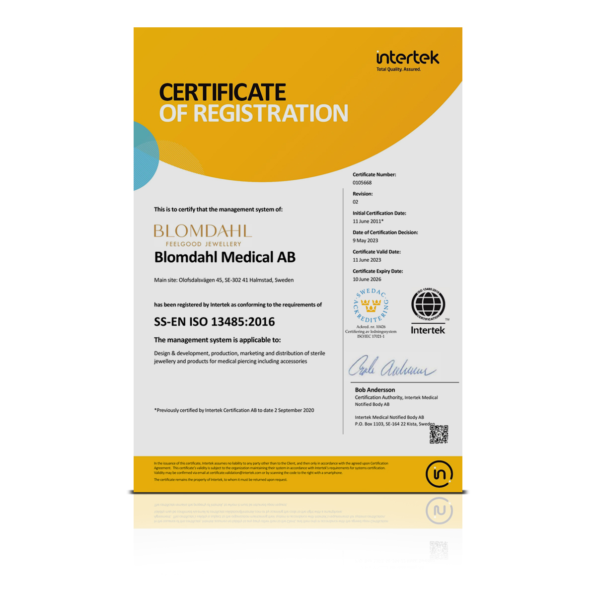 Zatwierdzona sterylizacja jest przeprowadzana zgodnie z normą dotyczącą wyrobów medycznych ISO 11135. To wszystko oznacza, że możemy zagwarantować pełną sterylność jednorazowych produktów do przekłuwania uszu i nosa. Blomdahl stawia na pierwszym miejscu aspekty medyczne. Posiadamy certyfikat zgodności z normą ISO 13485, która jest międzynarodową normą jakości dotyczącą produkcji wyrobów medycznych. Oznacza to, że jesteśmy regularnie kontrolowani przez niezależnych audytorów z jednostki notyfikowanej Intertek. Certyfikat jest dowodem na to, że każdy element biżuterii i każdy produkt do piercingu jest zawsze tak samo bezpieczny dla skóry i zdrowia Twoich klientów.